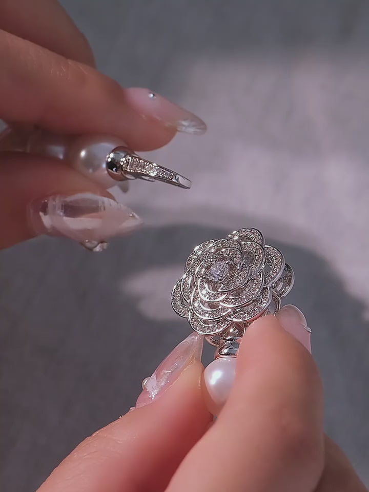 Crafted with pearls (main stone) and copper, the pearls have a natural, warm luster and rich internal layers, exuding pure beauty; the camellia shape is fully inlaid with cubic zirconia for a dazzling look. Adopting thick platinum plating, multi-layer electroplating technology and mirror polishing, the surface is smooth, delicate and high-quality. The necklace measures 43cm in chain length, about 20mm in flower width, and weighs approx 59g.